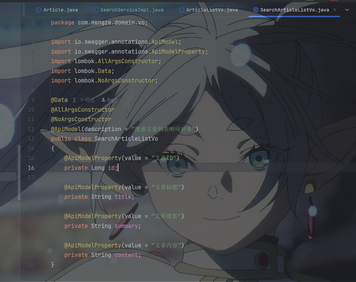其中传给前端的Vo要有文章id,文章摘要,文章标题和文章内容