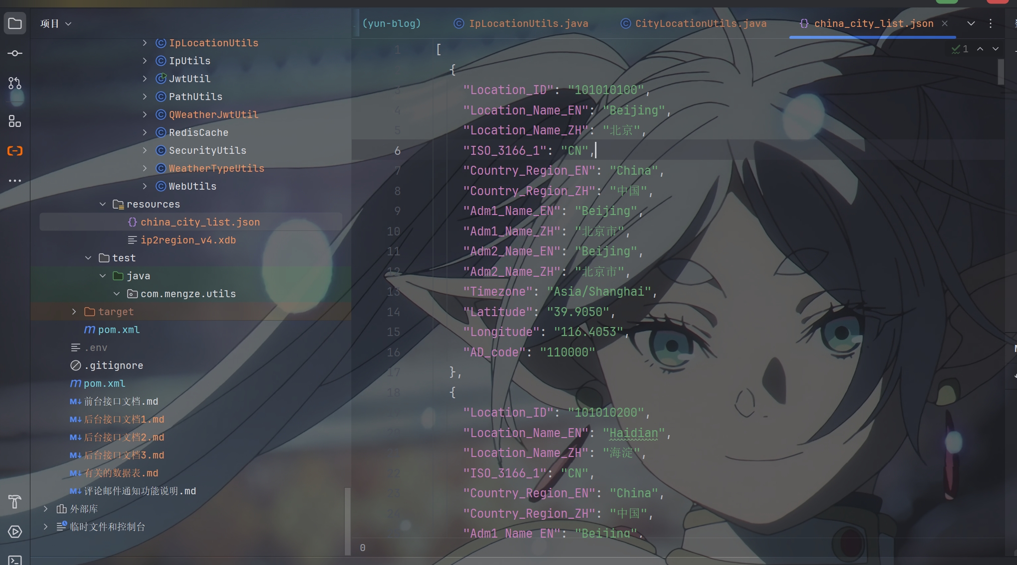 resolveCityNameByIp 方法通过调用 IpLocationUtils 类里的方法实现 根据客户端IP解析城市名称