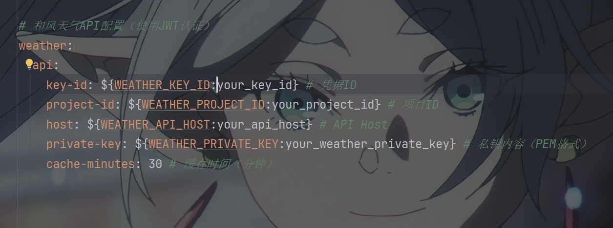 我们需要将keyId 凭据ID(在和风天气控制台获取)projectId 项目ID(在和风天气控制台获取)privateKeyPem 私钥内容(PEM格式)添加到项目的配置文件中