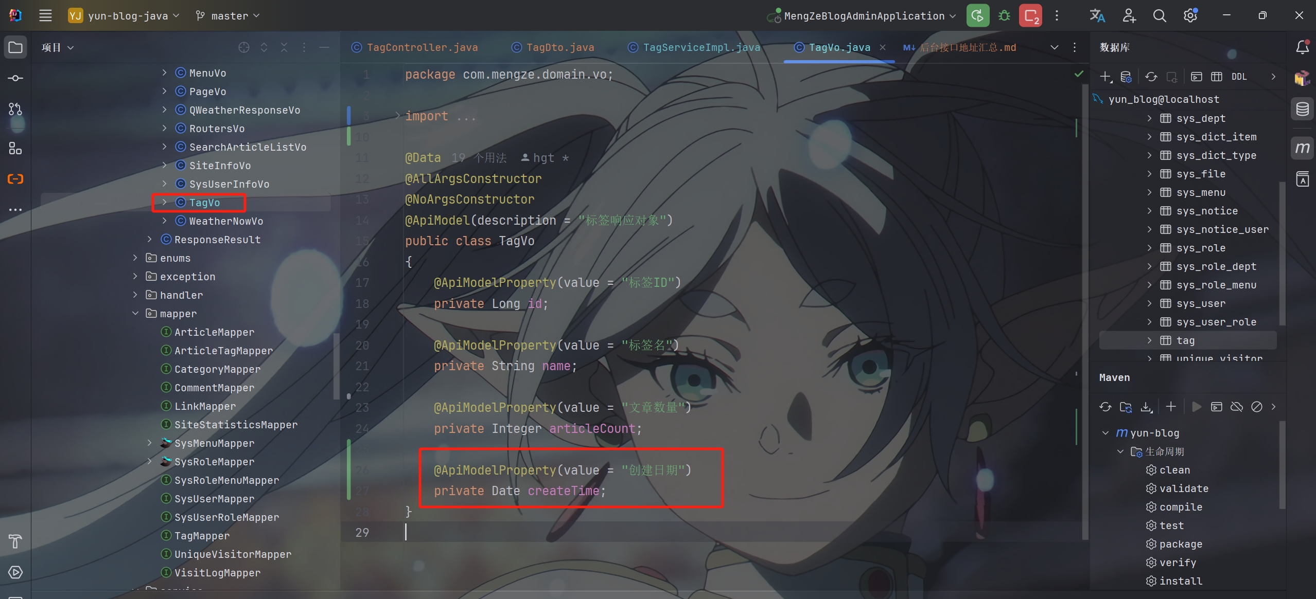 需要注意的是,由于前端需要接收标签的创建时间,所以要在TagVo里添加创建日期的参数